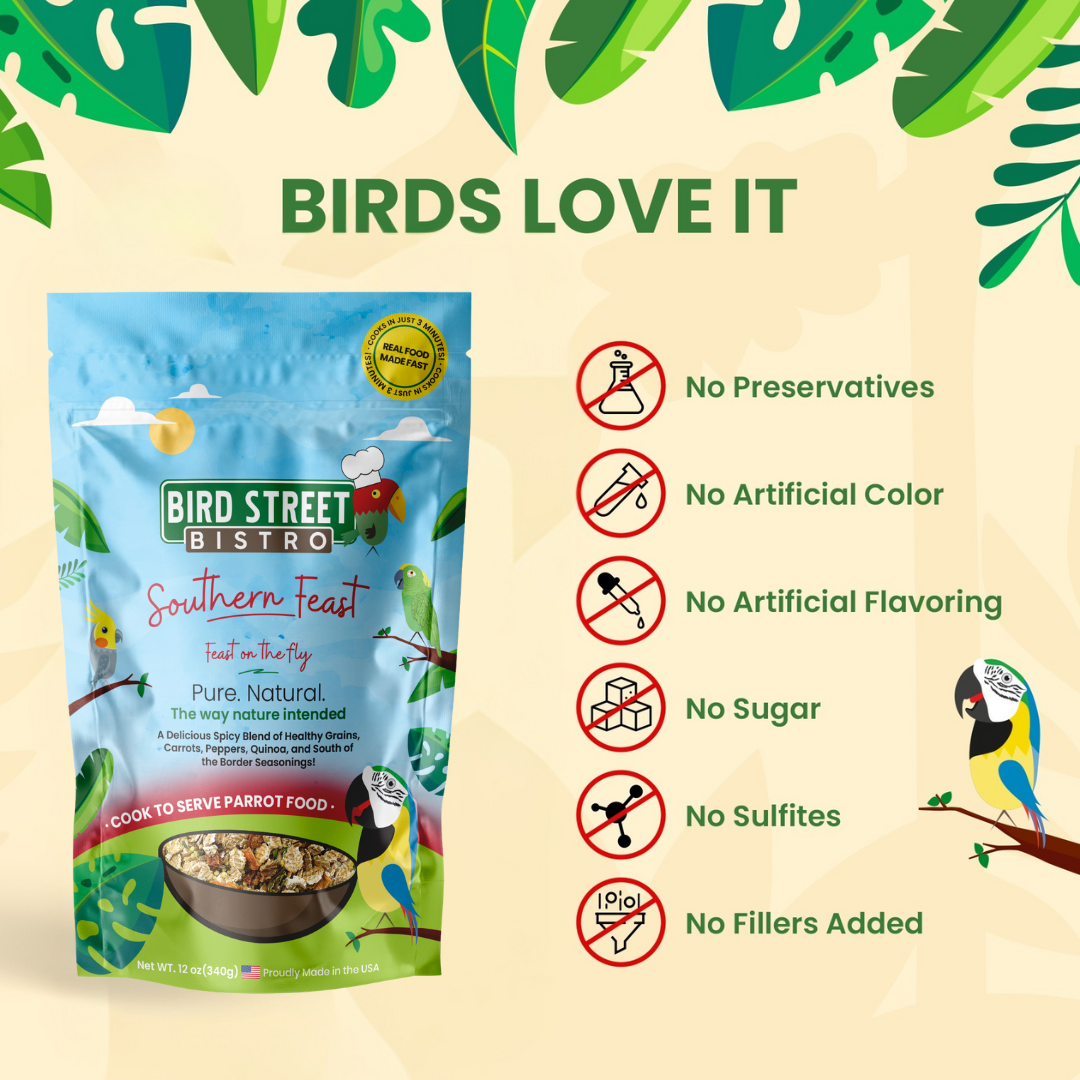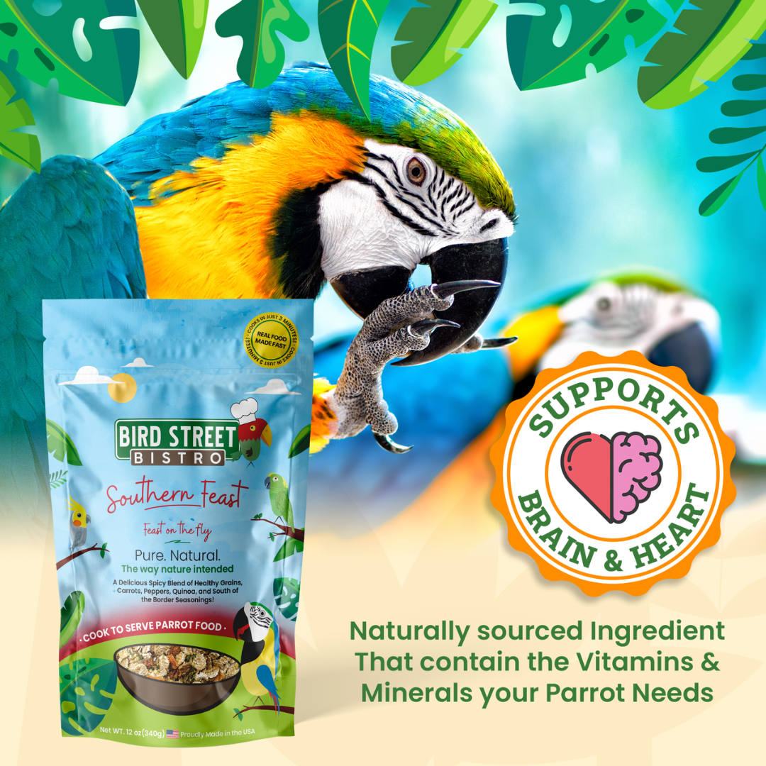 No matter where your feathered friend hails from, theyβll love this south of the border mix. The all-natural dried mix cooks in just 3 minutes and is packed with whole-food ingredients that are proven to be healthy food for parrots. Like all Bird Street Bistro flavors, the whole-grain base is full of nutrients, fiber, and amino acids. If youβre wondering what to feed your parrot, Southern Feast parrot food, an all-in-one blend, is the perfect answer. Dried peppers, carrots. and almonds add a delicious crunch that encourages active foraging. You can smell the Southern Feast spices while it cooks, and your bird will always be excited for meal time. Smell the vitamin-rich parsley, basil, cumin, kelp and cayenne!